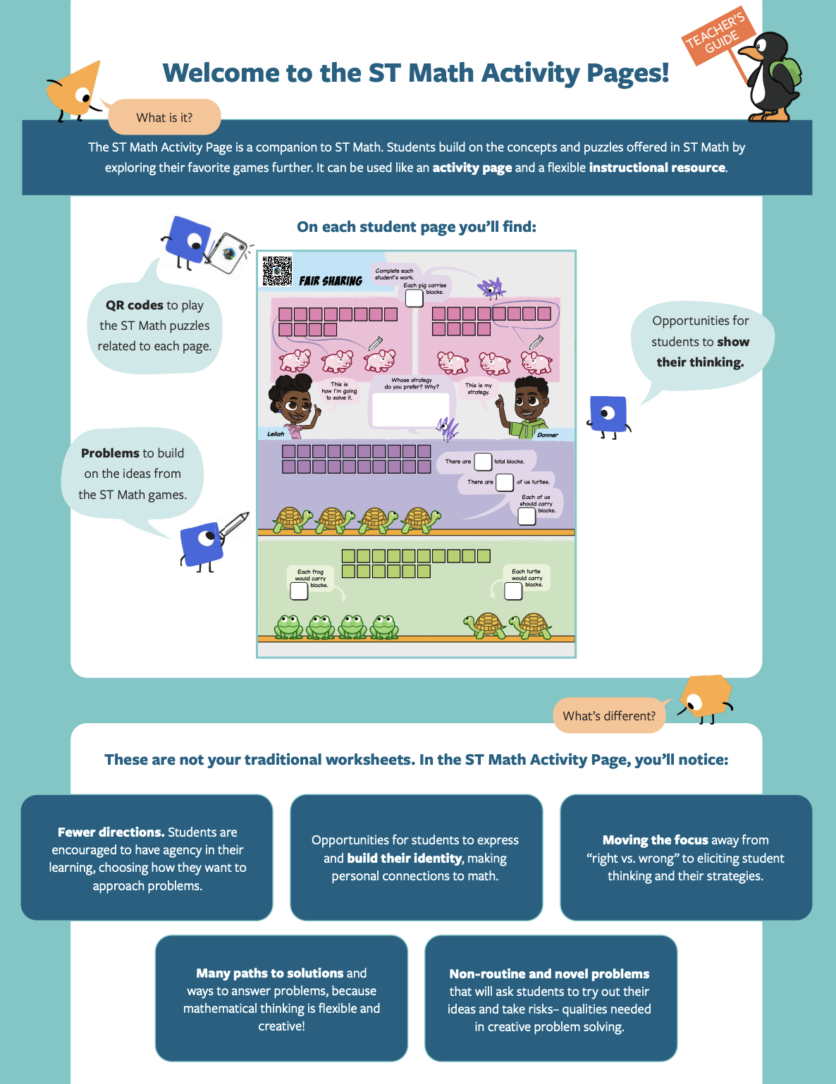 Teacher guides and answer keys are provided for each sample page. The teacher guide pages provide facilitation support and activities that teachers can do to support the learning on the page. Additionally, an online learning module is available to help teachers understand how to use these pages as well as provide other ideas to support their students who finish ST Math Journey early.